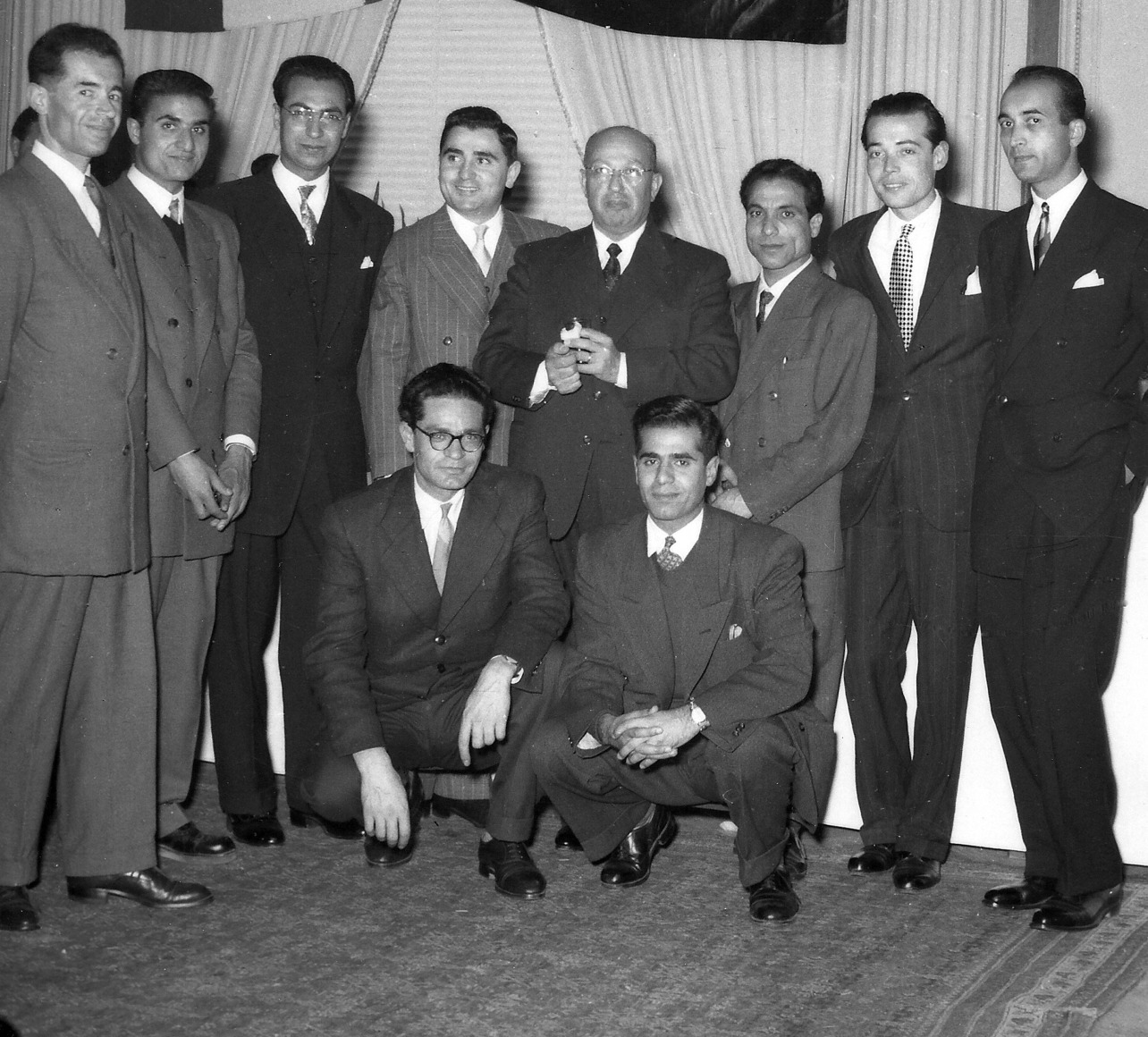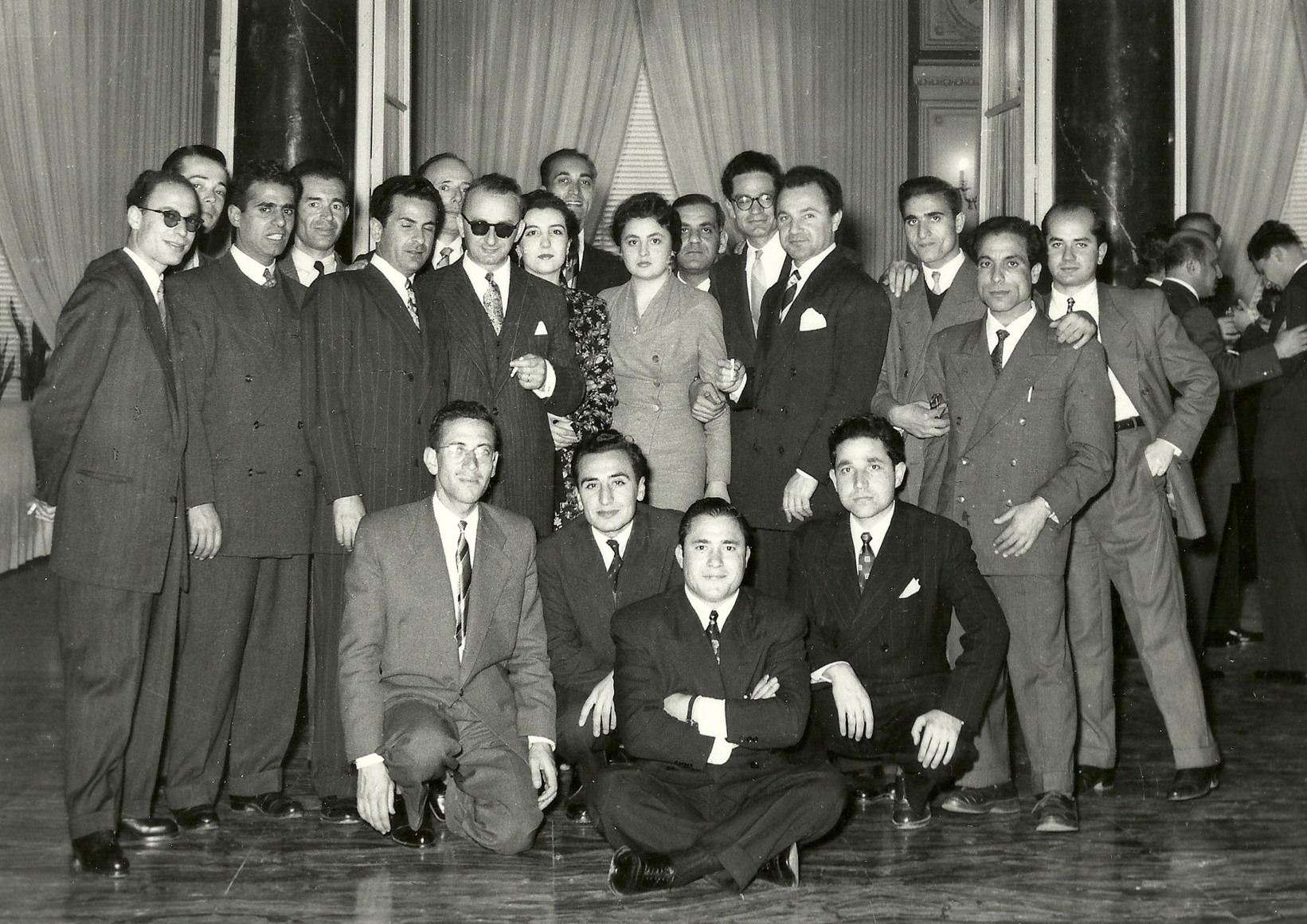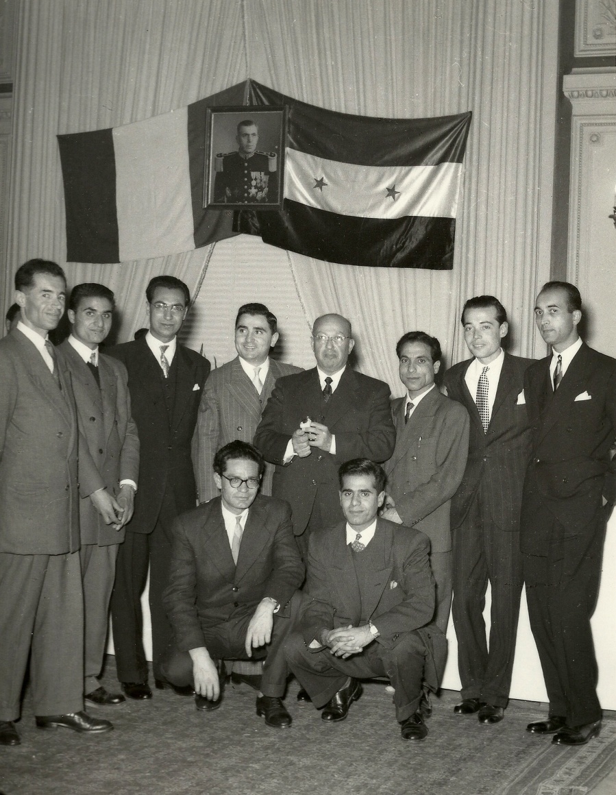 سيمون دومار ، فتحي محمد، ممدوح قشلان ، عدنان عرابي ، حيدر برازي ، إساميل حسني حقي ، أدهم إسماعيل وحسني الحريري، اليوم الوطني ، فندق غراند ، روما، ٣-١٢-١٩٥٣