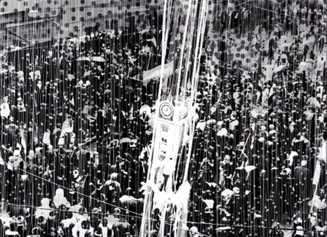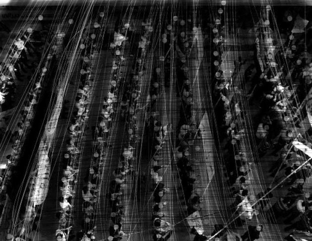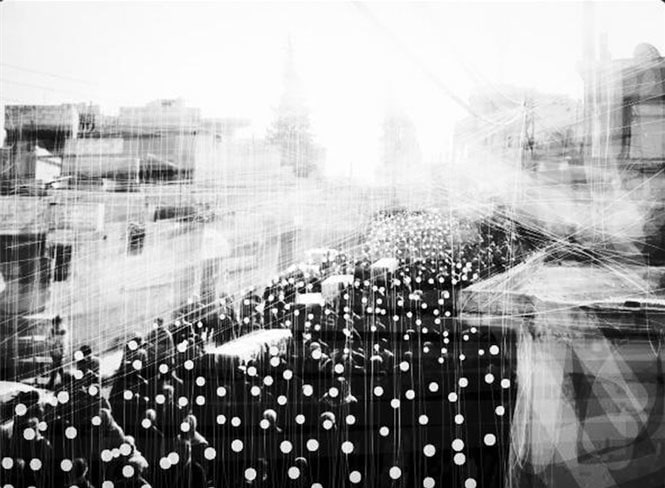 By reworking his photographs, Fahed adds layers of meaning to them. The resulting black and white images are scratched, outlined and redrawn. In the process, sometimes the faces disappear or are highlighted; children turn into angels or birds transform into planes. By bringing the reality of the photograph into a fictional world, the layered images hint at his perspective of the scene or people.