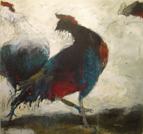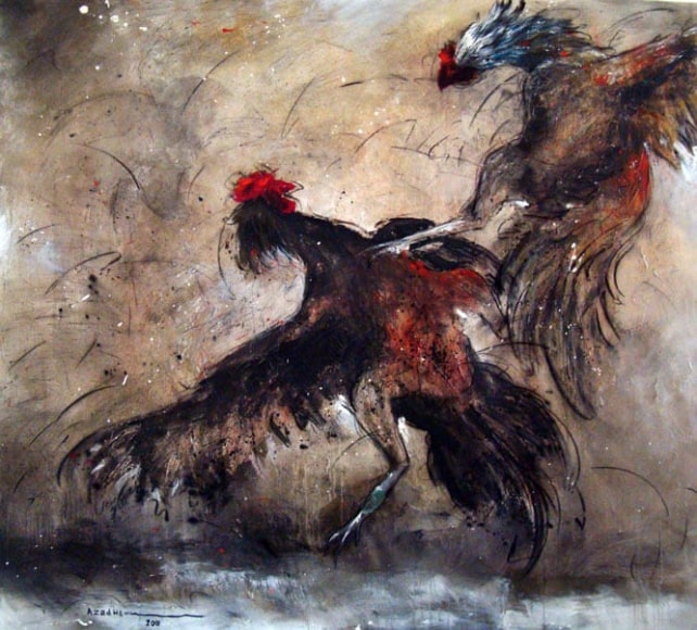 Inspired by his rural village in Syria, Kurdish artist Azad Heme paints cockfighting – a sport where people make roosters fight to the death for entertainment and money. An especially poignant subject when considered in the context of the war in Syria, he uses the theme symbolically over and over to show the relentlessness of the violence. “It's about confrontation,” he says. “There is no such thing as good and bad, there is conflict and constant confrontation.”