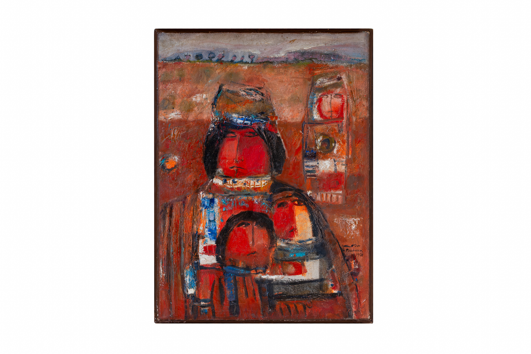 Reflecting the changing social and political environments of the time, Moudarres’ work took certain issues – such as the Syrian agricultural crisis or the civil war in Lebanon – and sought to depict the sorrow and the problems of the people. He painted sober figures with his characteristic solid square-shaped heads reminiscent of styles from Assyrian statuary, Palmyrene figures and Christian iconography. In much of his work, warm earthy colors are prevalent with thick textural brushstrokes and the occasional incorporation of sand into the paint.