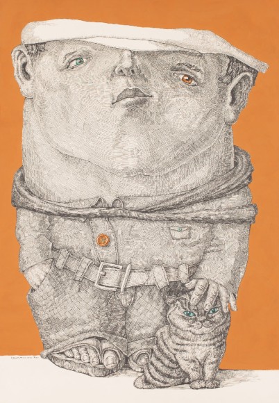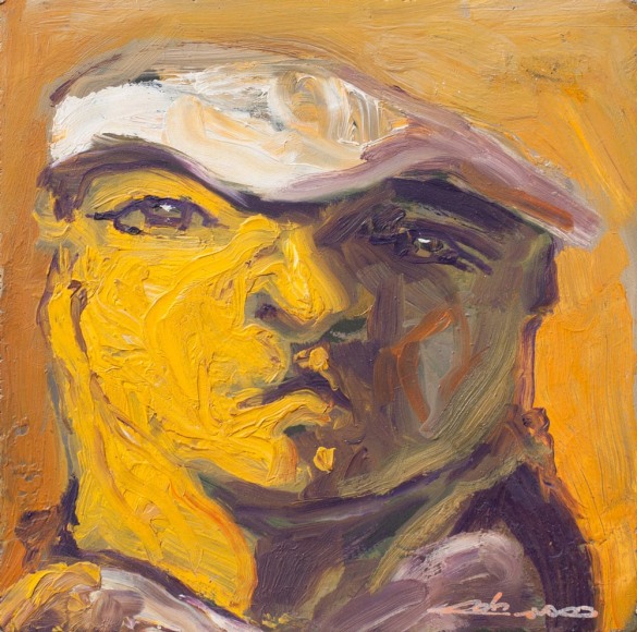 Born in Masyaf, Houmam Alsayed (1981) graduated from the Department of Sculpture, Institute of Applied Arts in Damascus in 2003. In his work, he depicts the reoccurring figure of a stooped man with a bulbous nose and wide-set eyes wearing a cloth cap. Putting the character in a variety of situations, his facial expressions depict nuanced, emotive states such as reflection, bewilderment and stoicism. This figure conveys, in our era, “the failure of all political, social and religious legends… You can find symbols referring to these legendary figures in my work. These figures are not only nostalgic about the past but also fearful about the future,” says the artist.