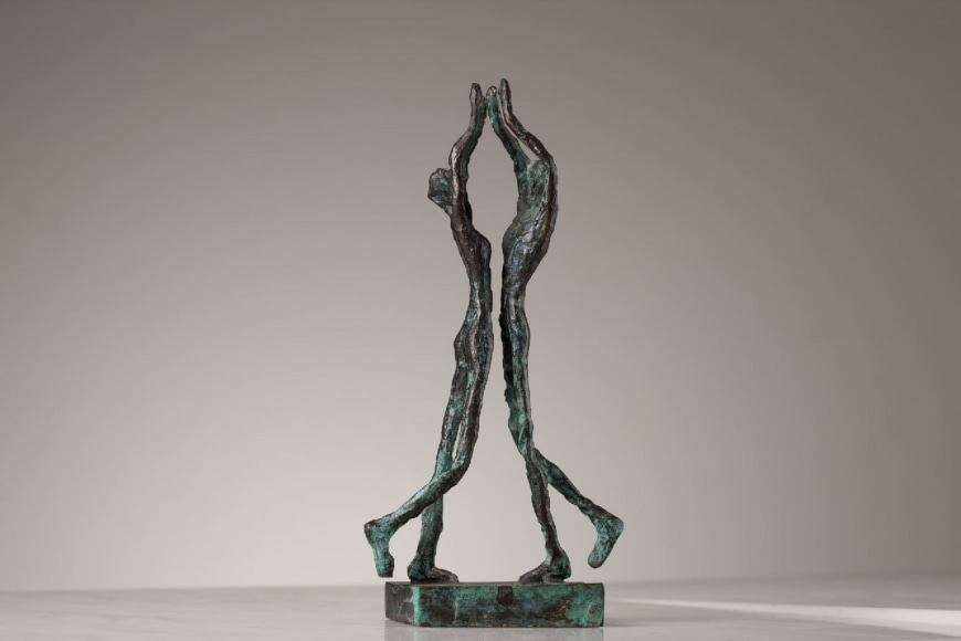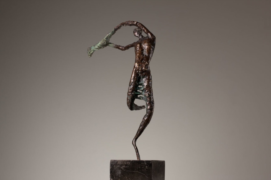 Sculpting in a variety of materials from wood to bronze, Ali’s oeuvre references emotion, psychological states, and past civilisations. Working in different expressionist styles, his sculptures include whimsical emotive figures, history-inspired busts, and abstracted ancient faces. He has been commissioned to create public monuments including The Gate of Syria for the Mediterranean Olympics, Pari, Italy; Tower of Memory, Damascus International Fairgrounds; and The Damascene Sword, Omayyad Square, Damascus, (co-produced with Ehsan Antabi).