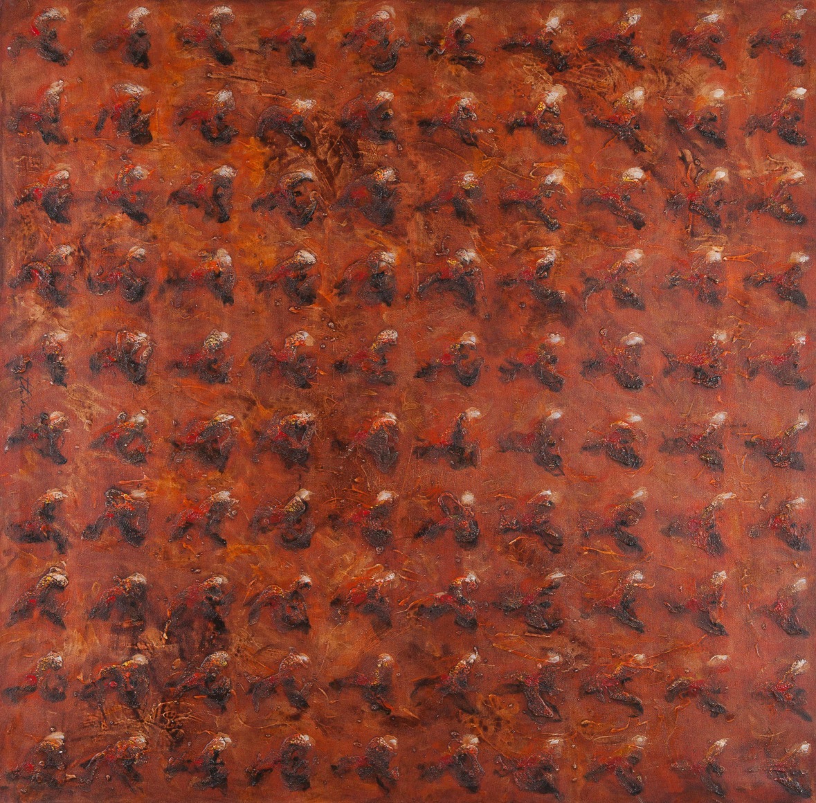 “Though I embody the pace of [the] people, I am but a bystander who imparts everything around me to my paintings,” says Thaier Helal. He further explains his methodology as: “…the background or reference is my cognitive, sensory, psychological and moral component, and through it, I have mastered my way of expressing myself, and thus expressing specific things that affect the conscience and the mind.” He goes on to say how this allows him to choose “the appropriate situation, form, content, and moment to reveal feelings and ideas, no matter how abstract they may be.”
