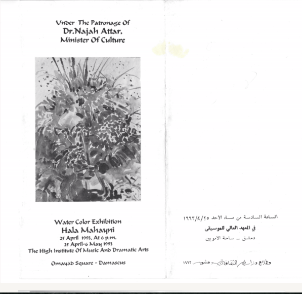 Brochure of Hala Hala Mahayni exhibition at the Higher Institute of Music and Dramatic Arts in Damascus, forward by Tariq AlSharif, Fateh Mudarres, and Elias Zayat, 1993.