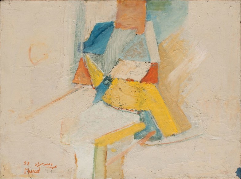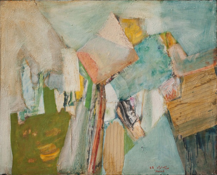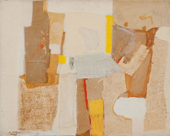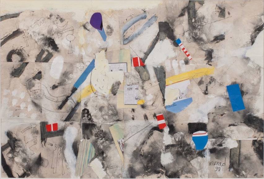 Exploring the tension between balance and imbalance, Murad’s technique varies from thick slabs of paint to thin translucent layers, playing with textures and surfaces, adding collages composed of newspaper clippings or other media. Known for this process of layering his compositions, he says: “A painting takes time to reveal itself… It does not reveal its secrets at first glance.”